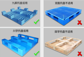 要盡可能選用國際標準的托盤規格,以便于托盤的交換和使用。一般的叉車都適用九腳托盤、川字托盤,并且九腳托盤和川字托盤的內寬均需要大于貨叉的外寬。像田字托盤和雙面托盤并不適用所有的搬運車。