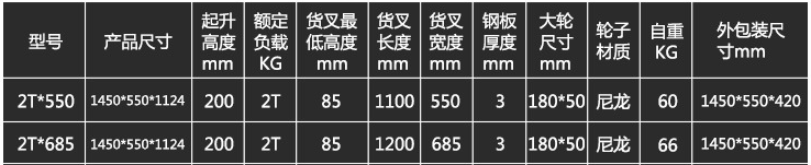 搬運車分為兩種型號:550型和685型,其具體的相關尺寸見上圖所示。其輪子也分為2種,一種是尼龍輪,一種是橡膠輪。尼龍輪適合水泥地面,橡膠輪適合大理石、油漆、環(huán)氧地面。