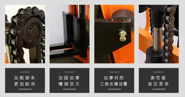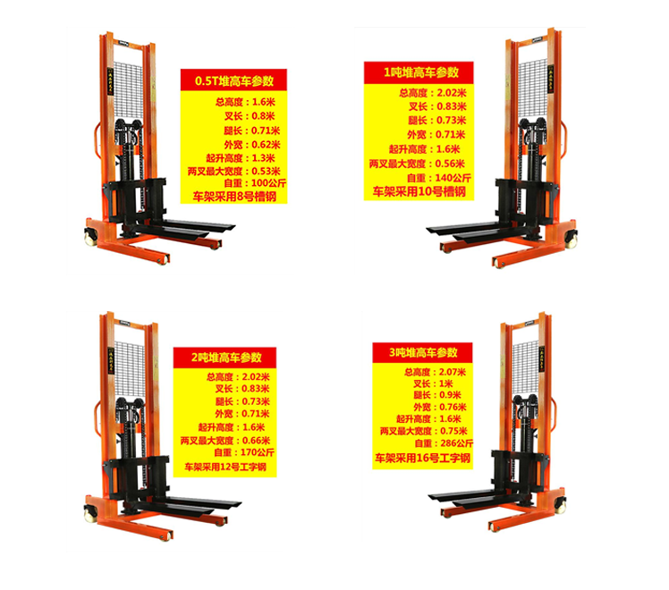 4. 手動液壓堆高車是一種無污染的手動液壓堆高車,具備運輸靈巧,操作靈活,轉彎半徑小等特點。